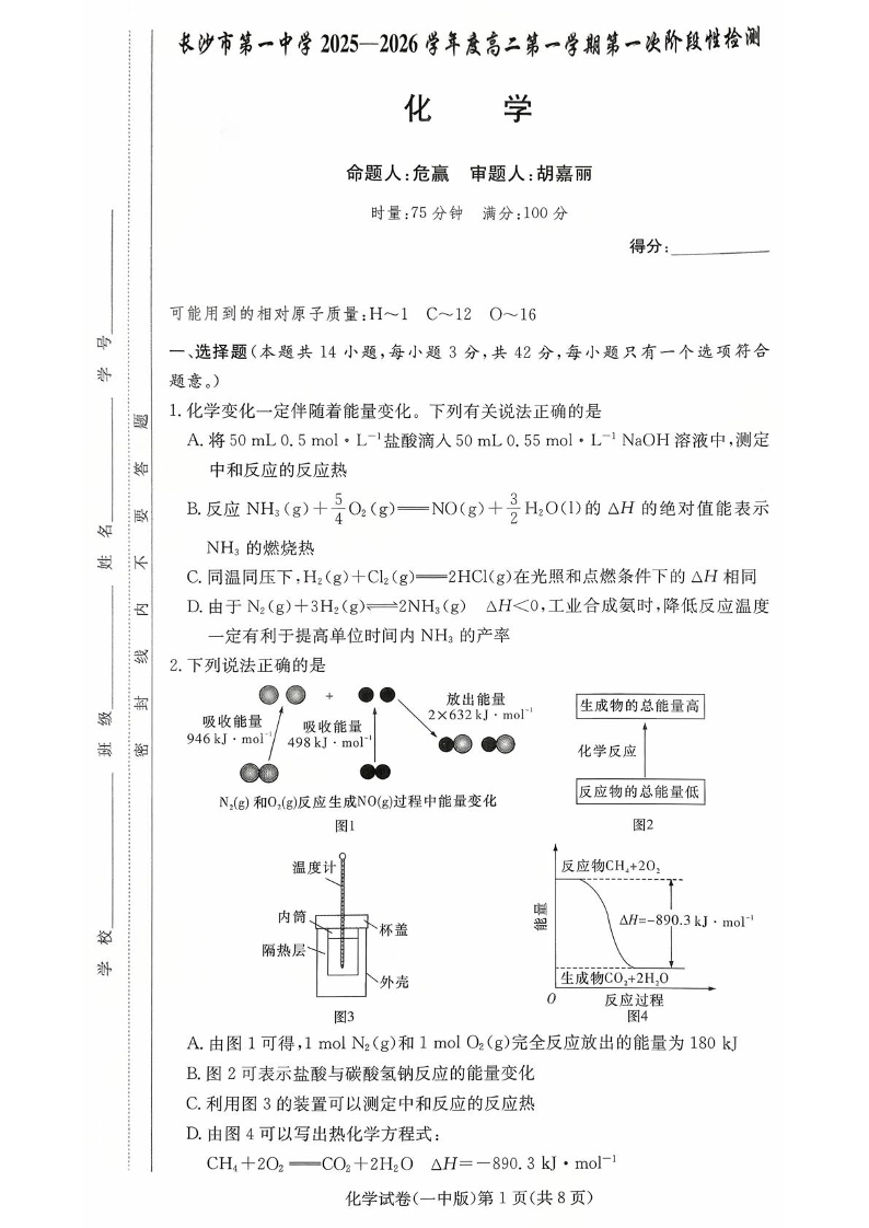 湖南省长沙市第一中学2025-2026学年高二上学期10月月考 化学试题(含答案).pdf