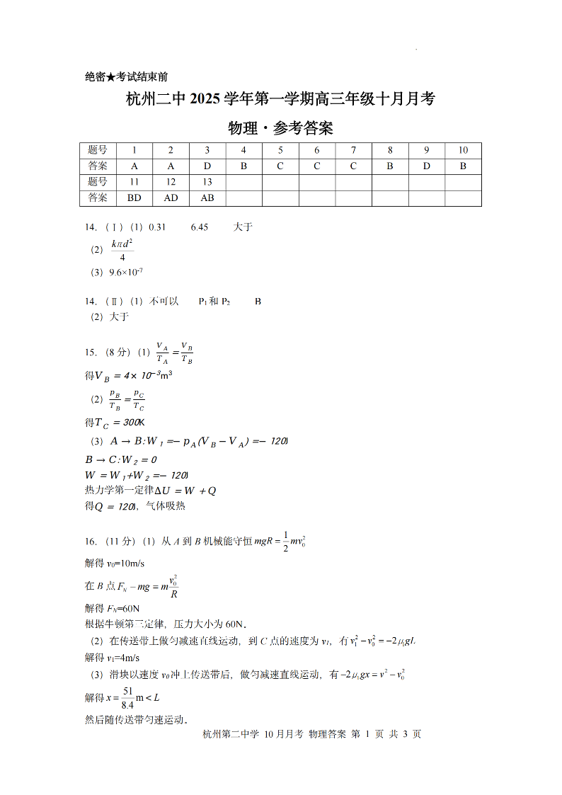 杭州第二中学2025年10月高三年级适应性检测 物理答案.pdf