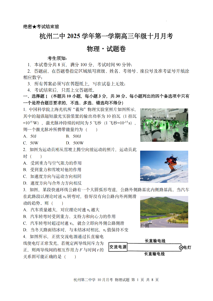 杭州第二中学2025年10月高三年级适应性检测 物理.pdf