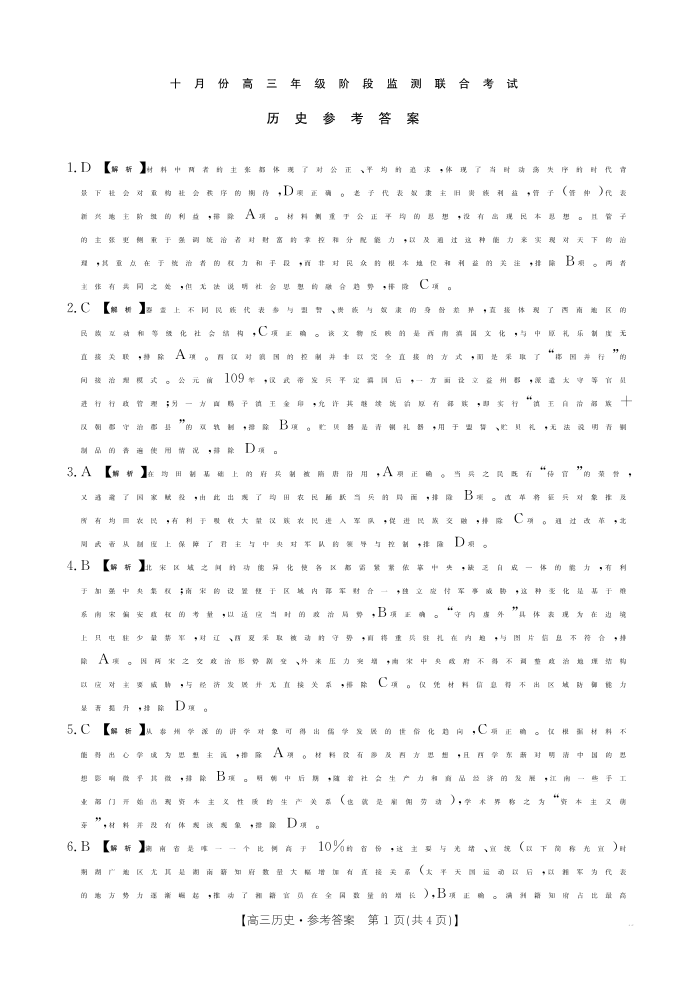 湖南省十月份高三年级阶段监测联合考试 历史答案.pdf