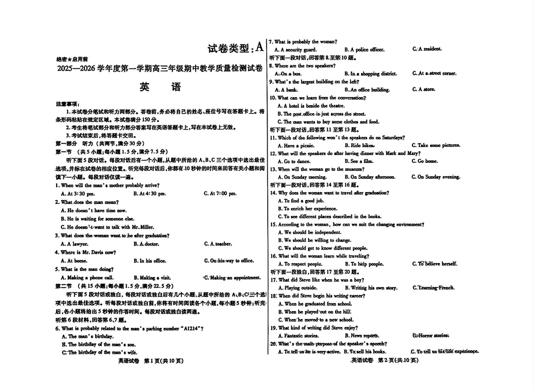 2025—2026学年度第一学期高三年级期中教学质量检测 英语.pdf