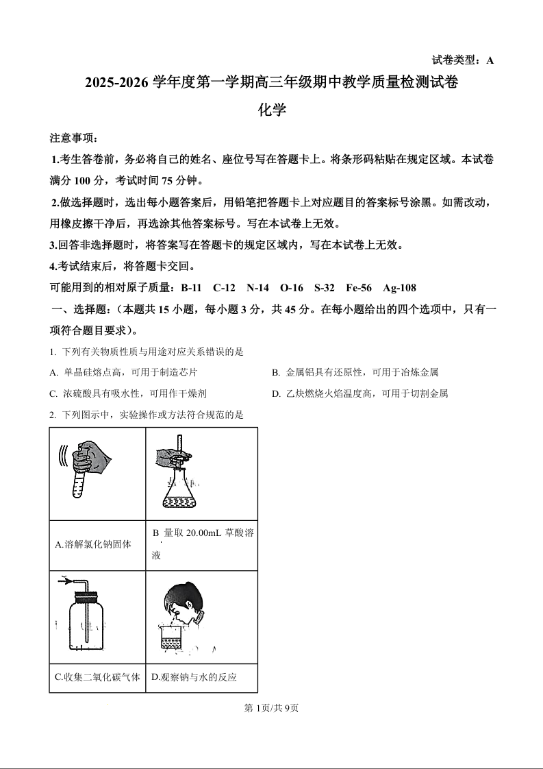2025—2026学年度第一学期高三年级期中教学质量检测 化学.docx