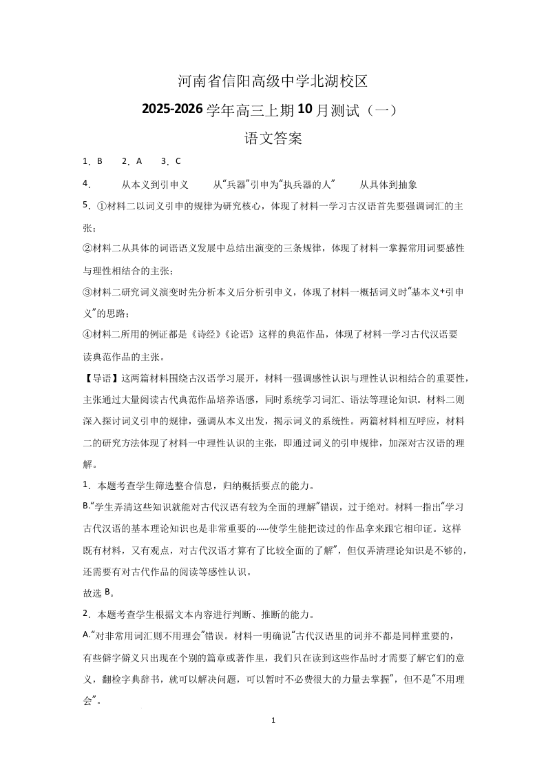 河南省信阳高级中学2026届高三上学期10月测试(一)语文答案.docx