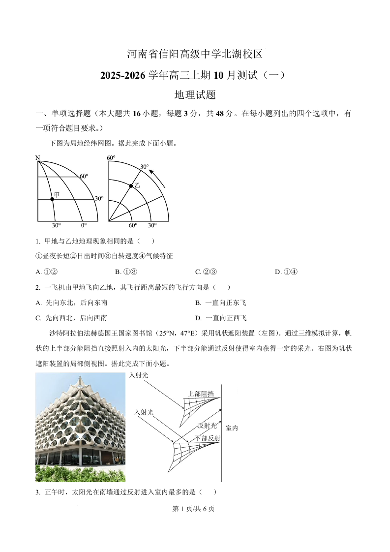 河南省信阳高级中学2026届高三上学期10月测试(一)地理.docx