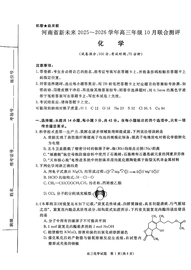 河南省新未来2025-2026学年高三年级10月联合测评-化学.pdf