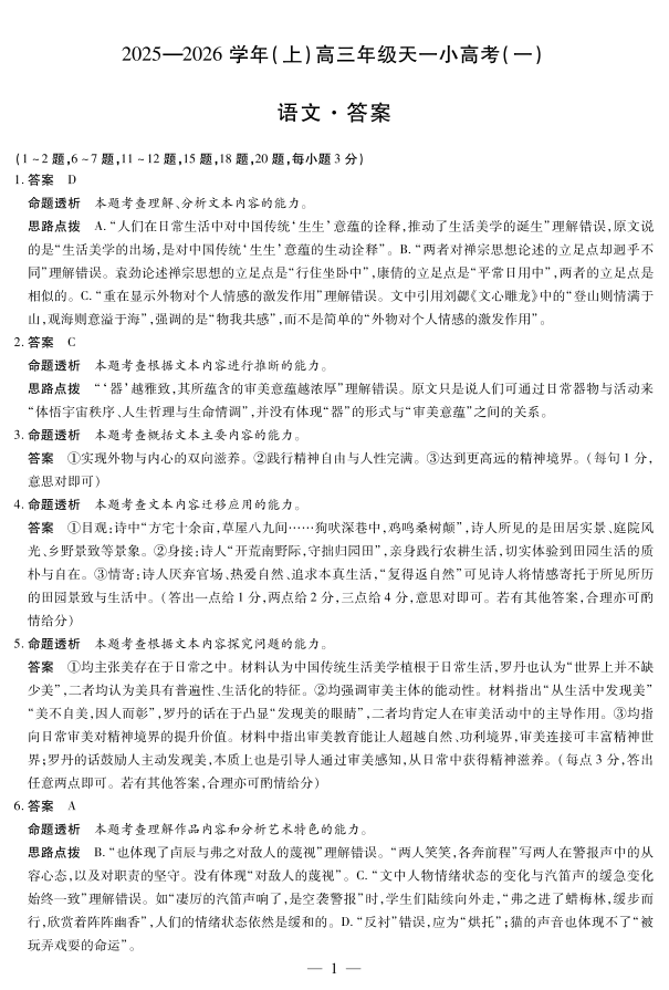 河南省2025-2026学年(上)高三年级天一小高考(一)语文答案.pdf