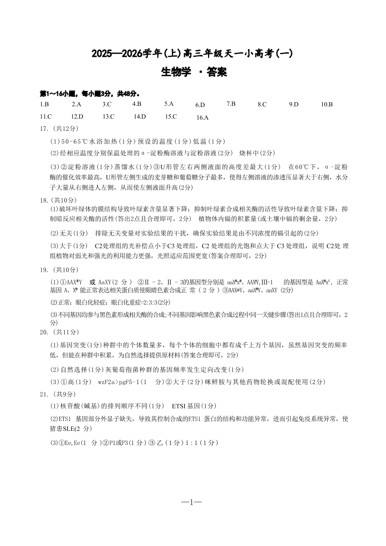 河南省2025-2026学年(上)高三年级天一小高考(一)生物答案.pdf