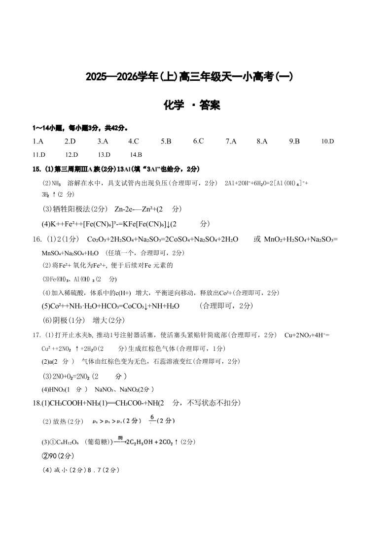 河南省2025-2026学年(上)高三年级天一小高考(一)化学答案.pdf