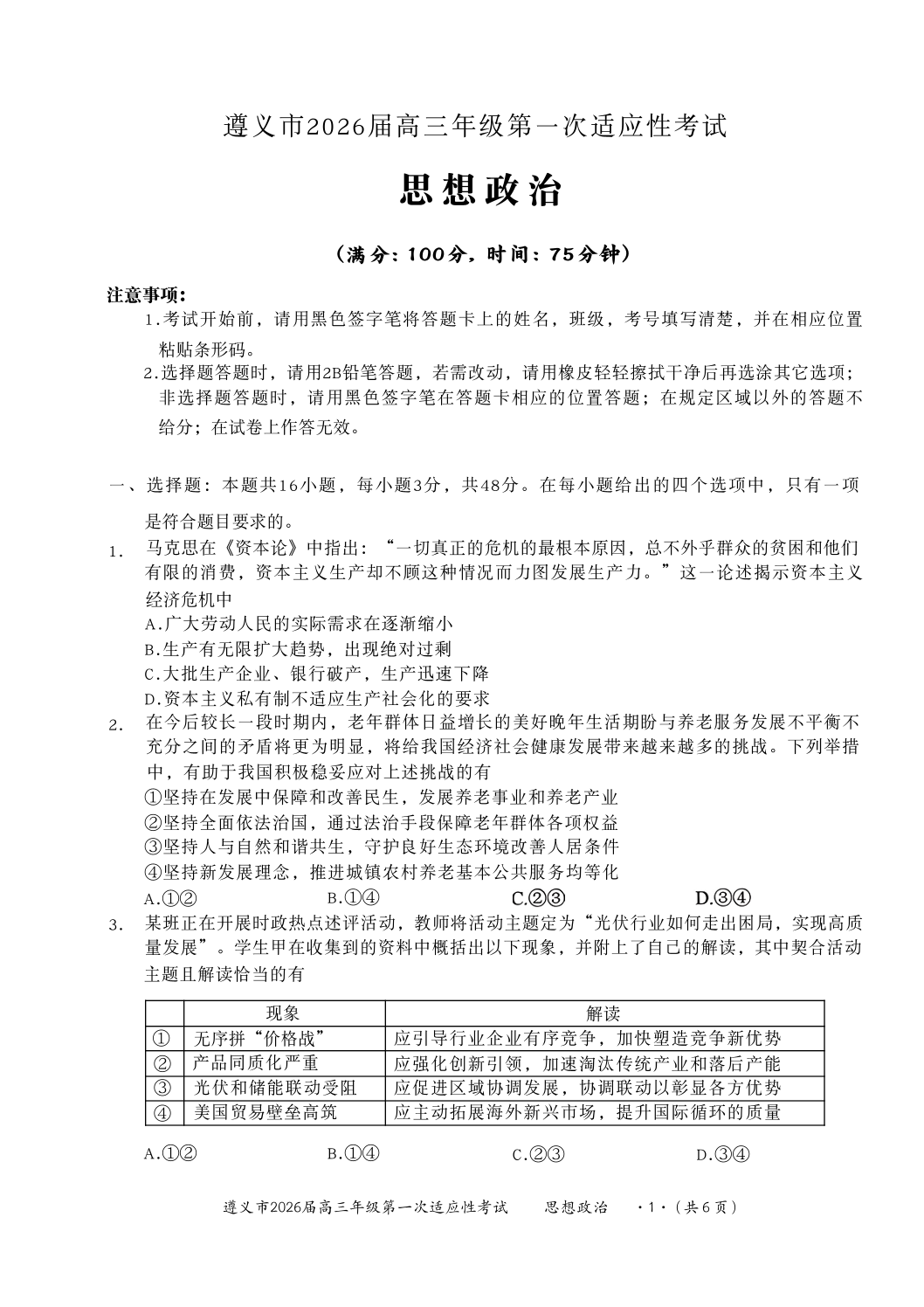 遵义市2026届高三年级第一次适应性考试 政治.pdf