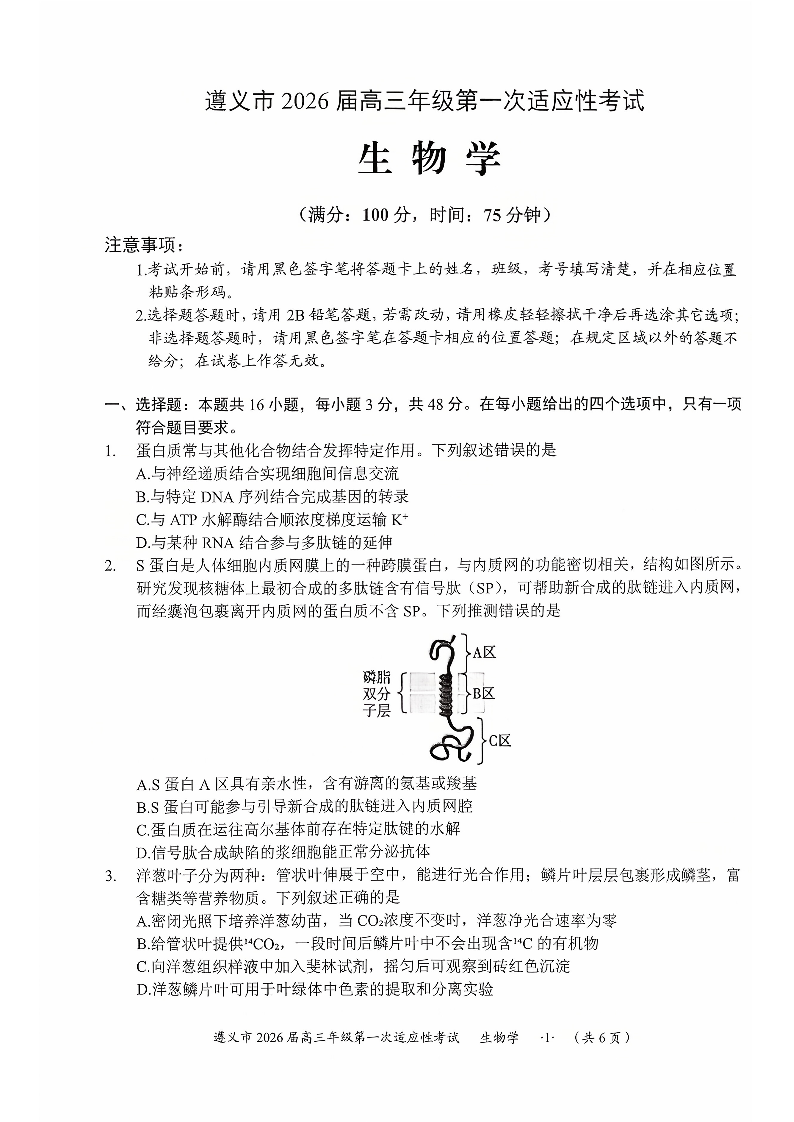 遵义市2026届高三年级第一次适应性考试 生物.pdf