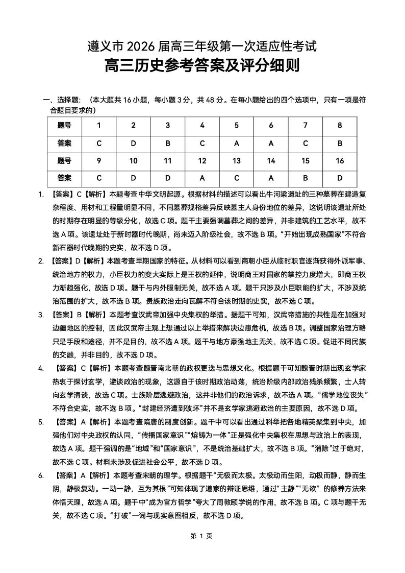 遵义市2026届高三年级第一次适应性考试 历史答案.pdf