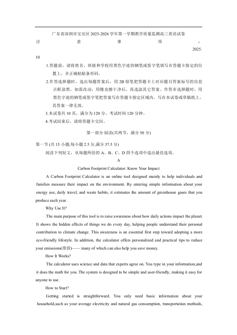 广东省深圳市宝安区2025-2026学年高三上学期教学质量检测 英语.docx