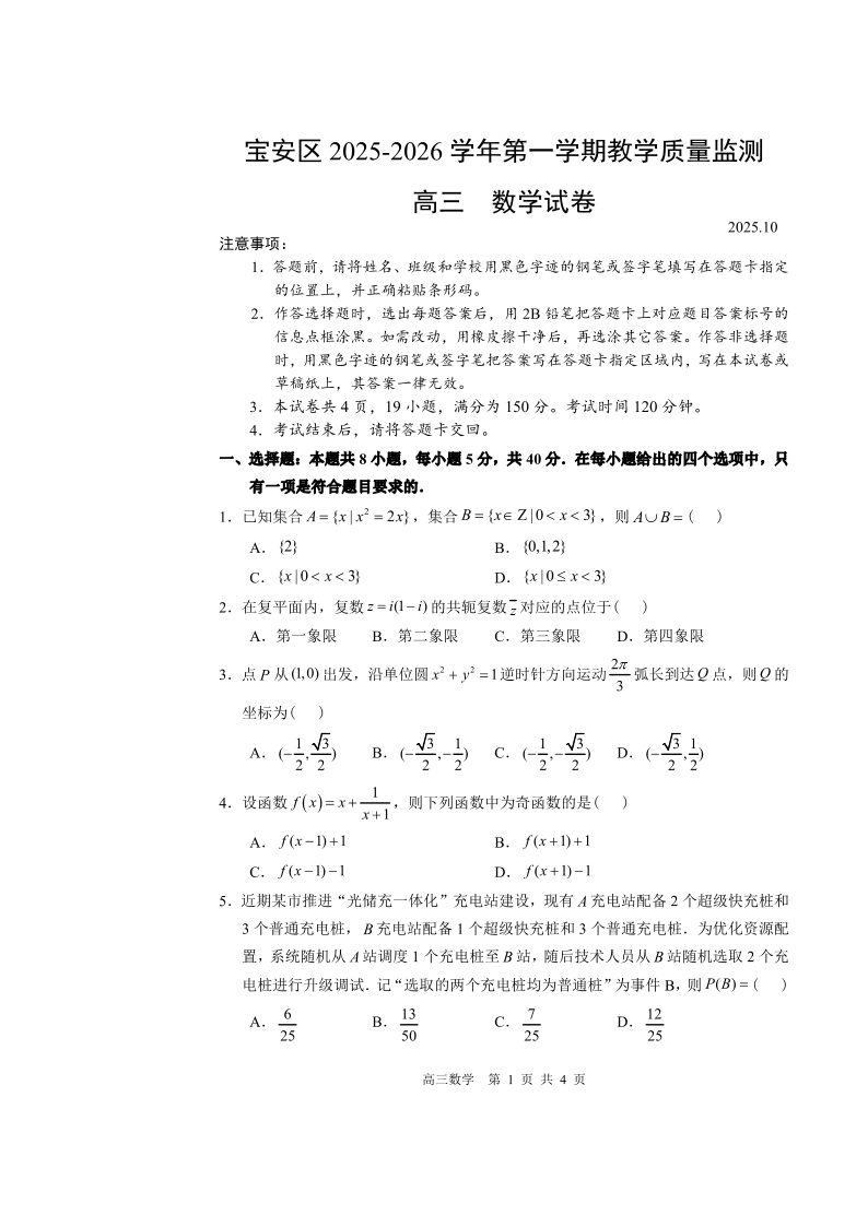 广东省深圳市宝安区2025-2026学年高三上学期教学质量检测 数学.pdf
