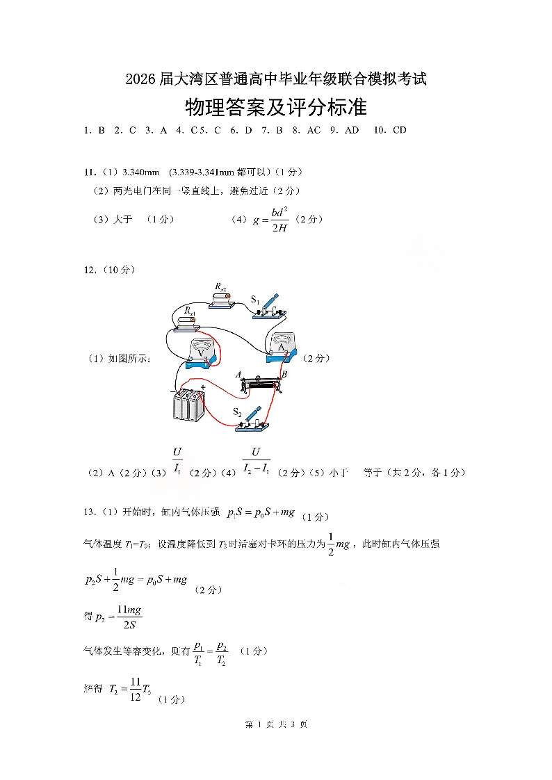 广东省大湾区2026届普通高中毕业年级联合模拟考试 物理答案.pdf