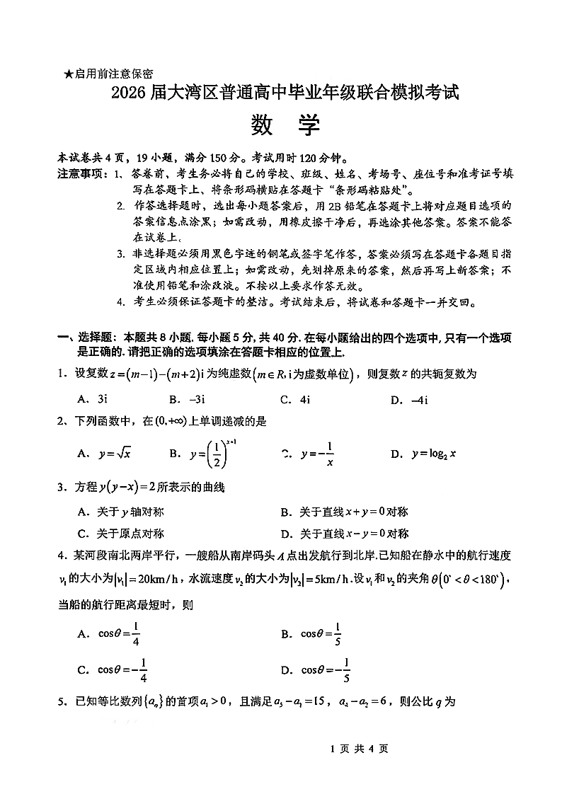 广东省大湾区2026届普通高中毕业年级联合模拟考试 数学.pdf