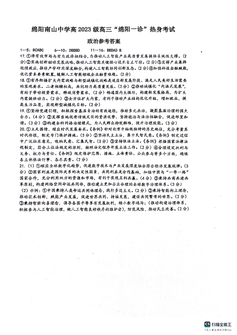 绵阳南山中学高2023级“绵阳一诊”热身考试 政治答案.pdf