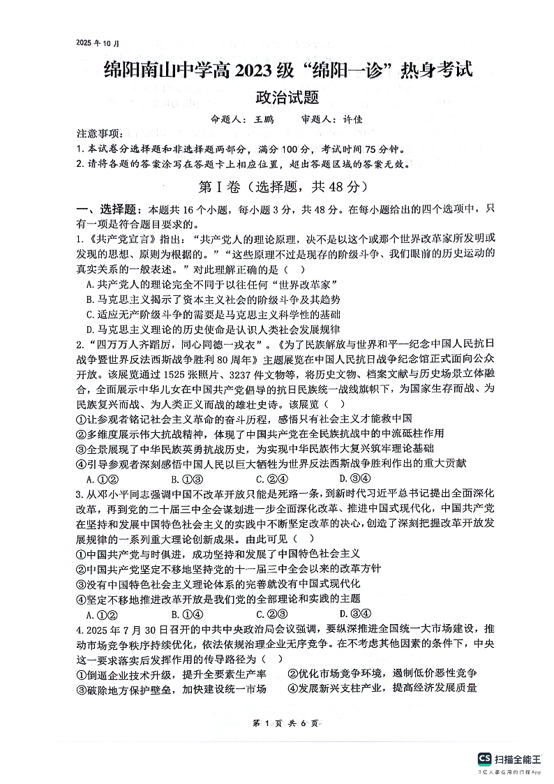 绵阳南山中学高2023级“绵阳一诊”热身考试 政治.pdf