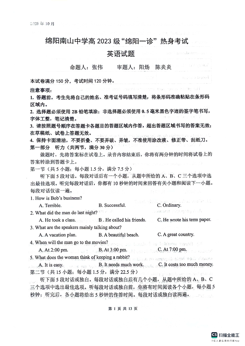 绵阳南山中学高2023级“绵阳一诊”热身考试 英语.pdf
