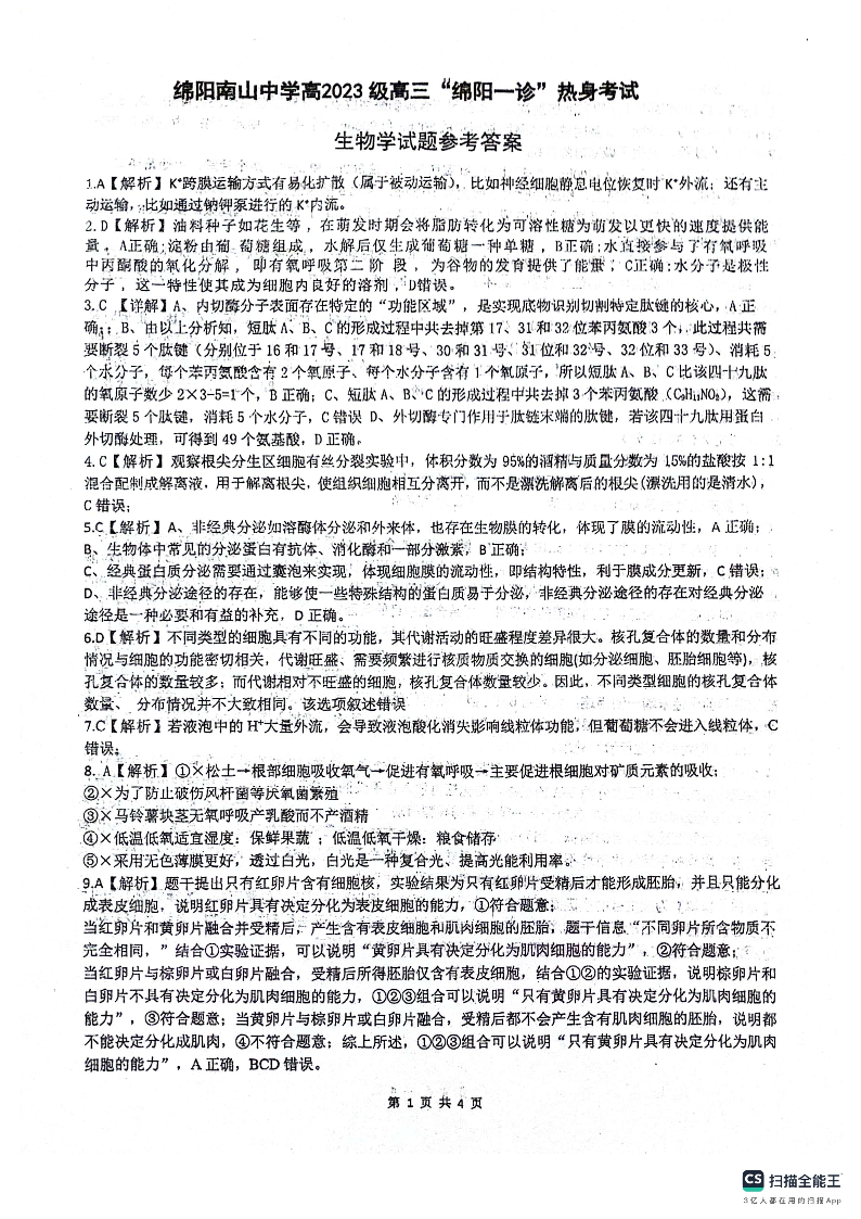 绵阳南山中学高2023级“绵阳一诊”热身考试 生物答案.pdf