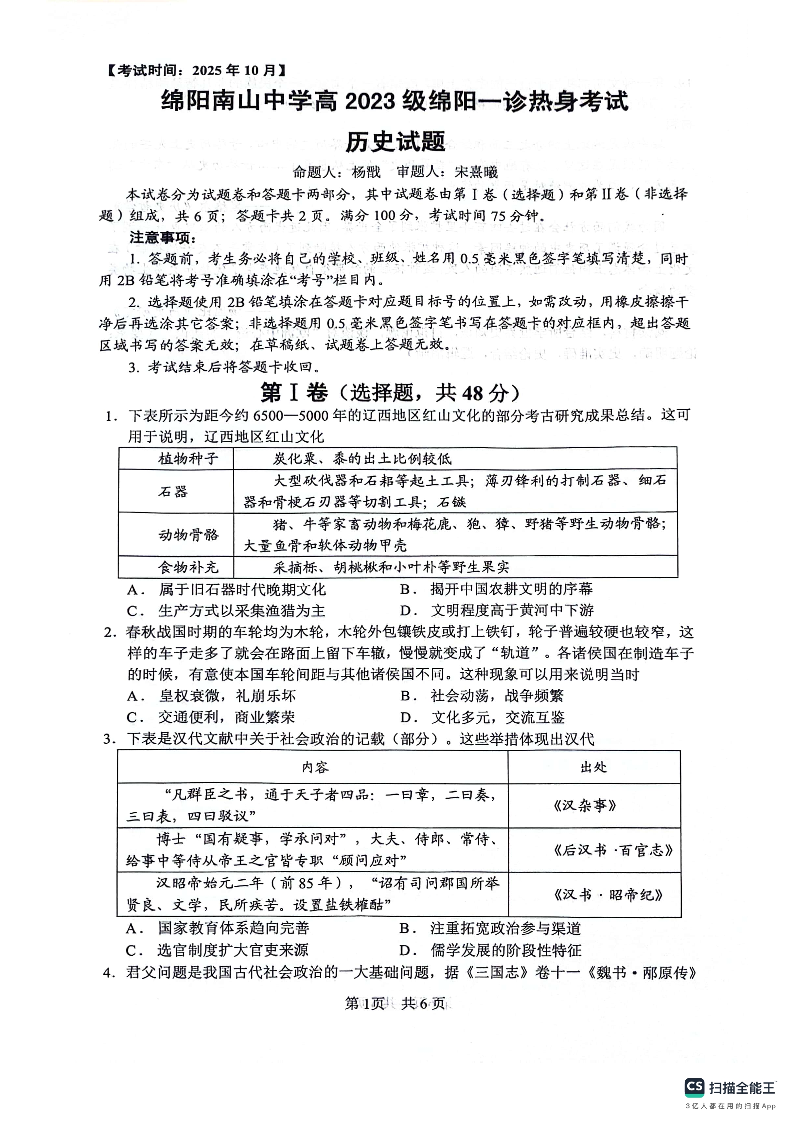 绵阳南山中学高2023级“绵阳一诊”热身考试 历史.pdf