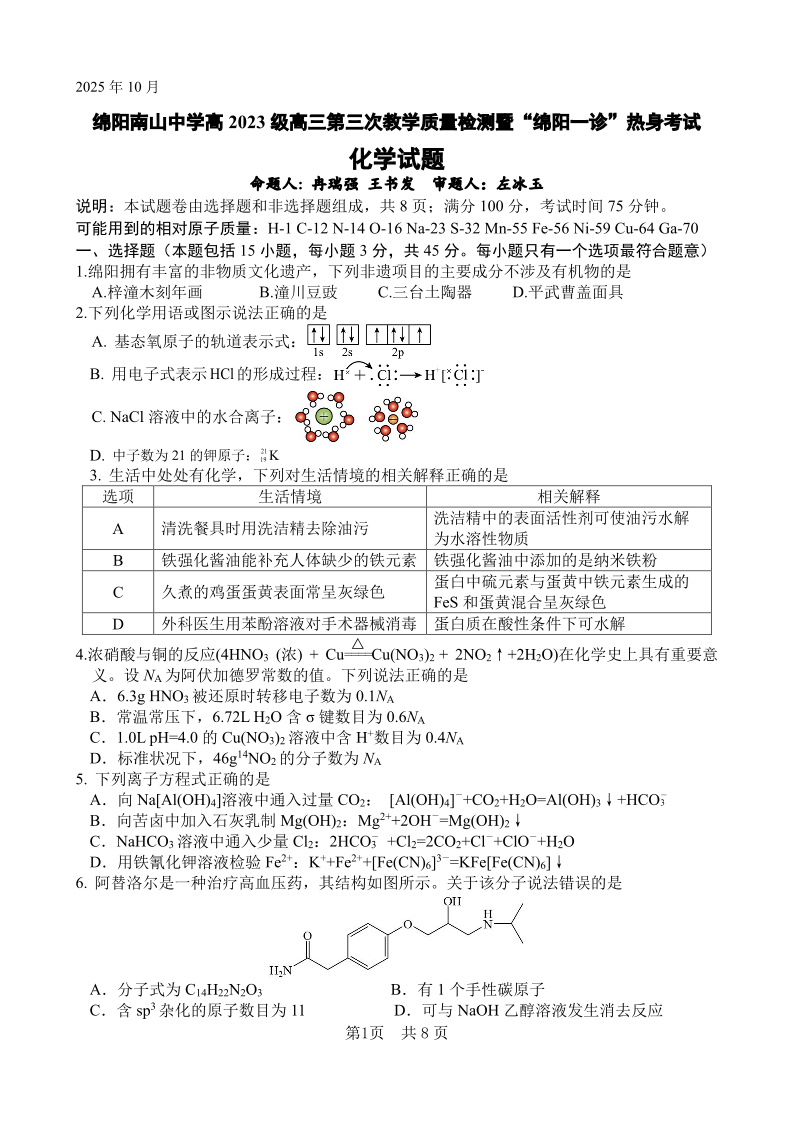 绵阳南山中学高2023级“绵阳一诊”热身考试 化学.pdf