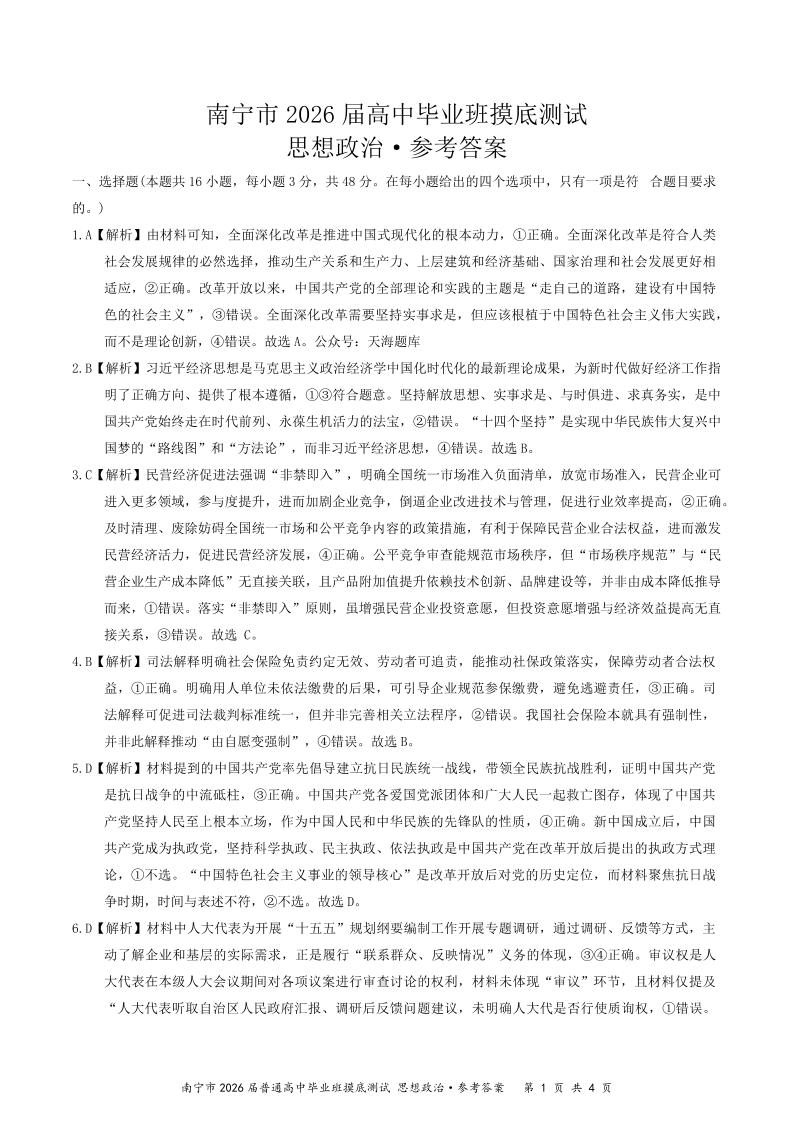 南宁市2026届高中毕业班摸底测试 政治答案.pdf