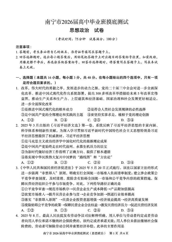 南宁市2026届高中毕业班摸底测试 政治.pdf