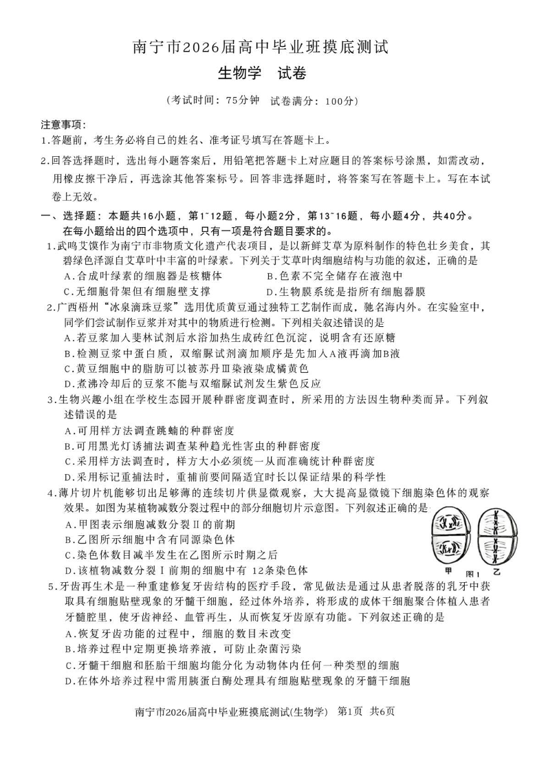 南宁市2026届高中毕业班摸底测试 生物.pdf
