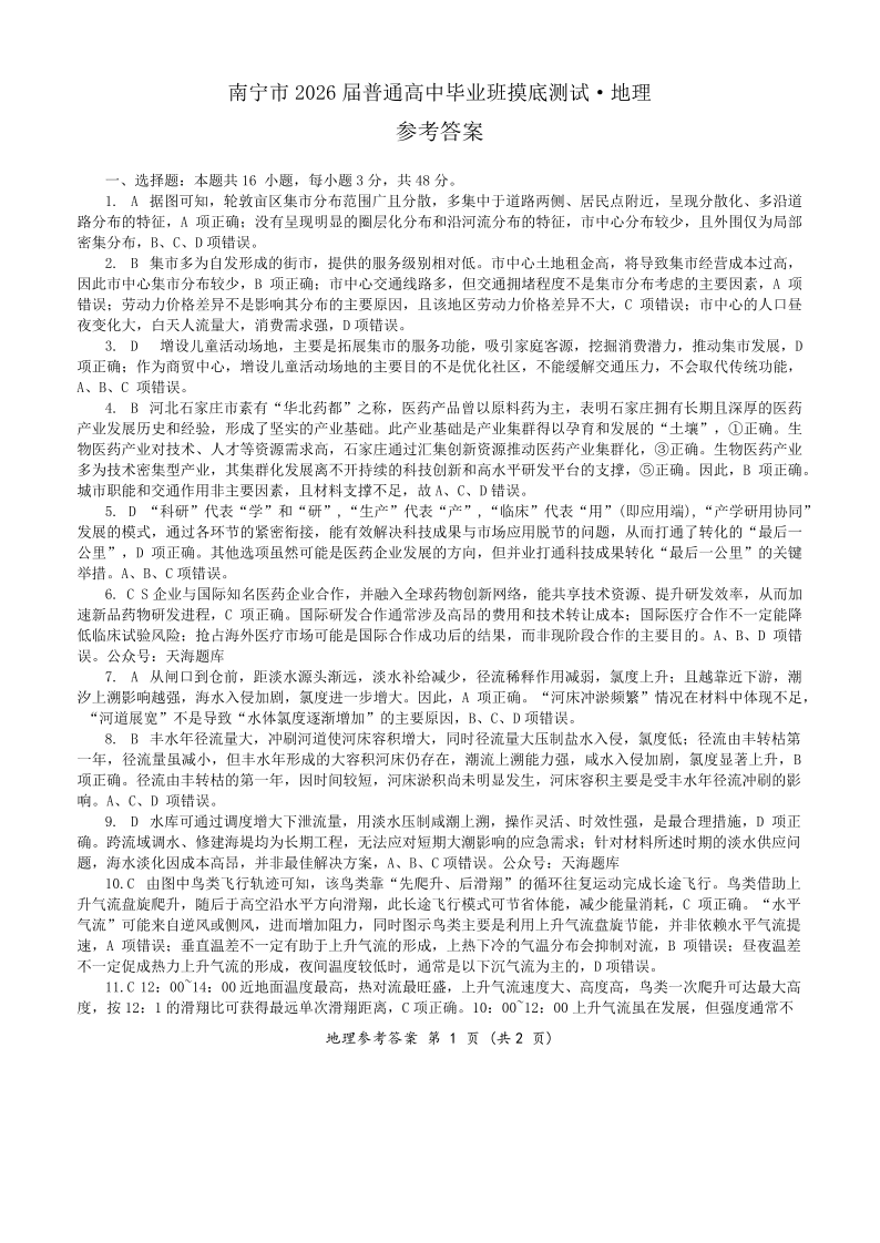 南宁市2026届高中毕业班摸底测试 地理答案.pdf