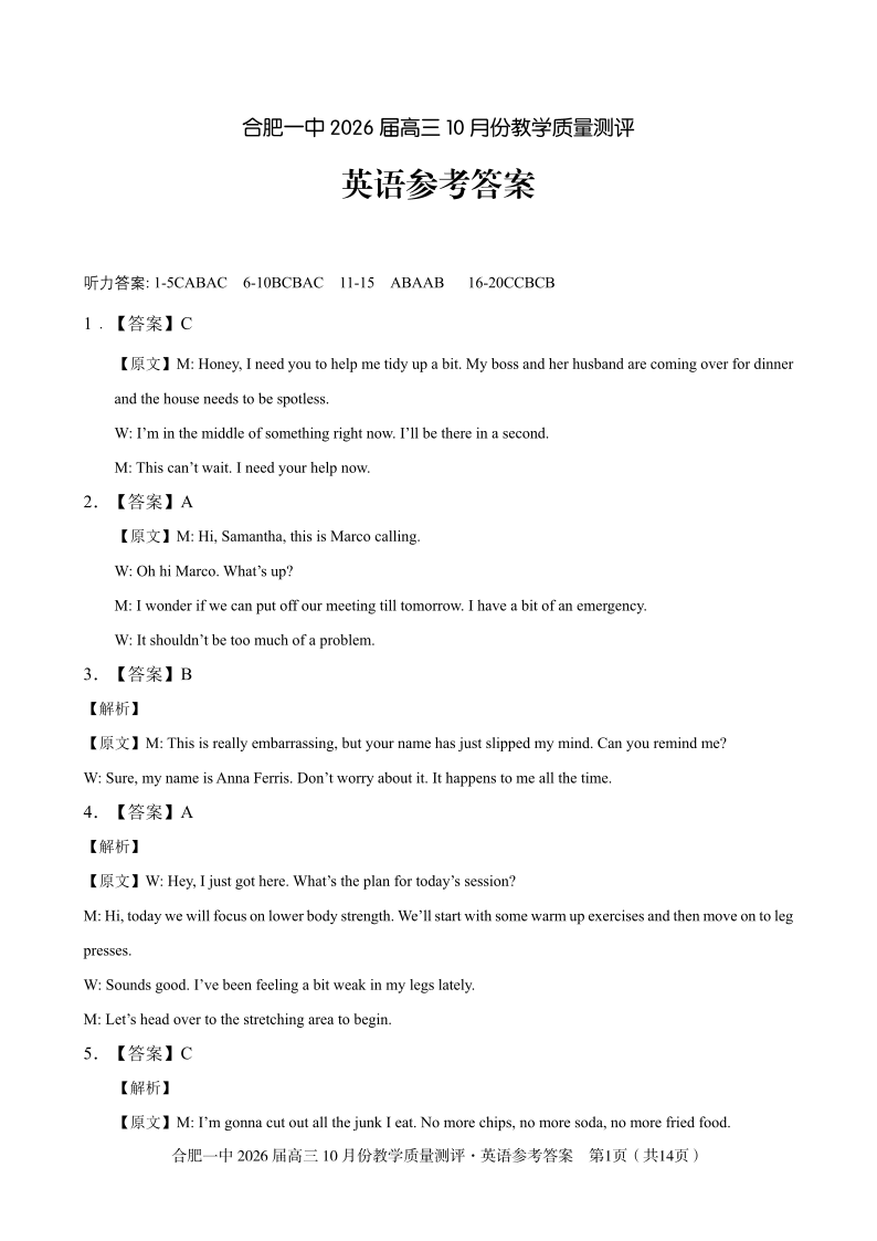 合肥一中2026届高三10月份教学质量测评 英语参考答案.pdf
