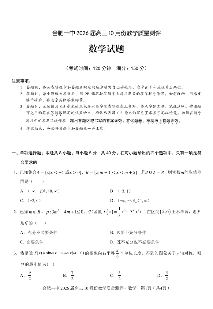 合肥一中2026届高三10月份教学质量测评 数学.pdf
