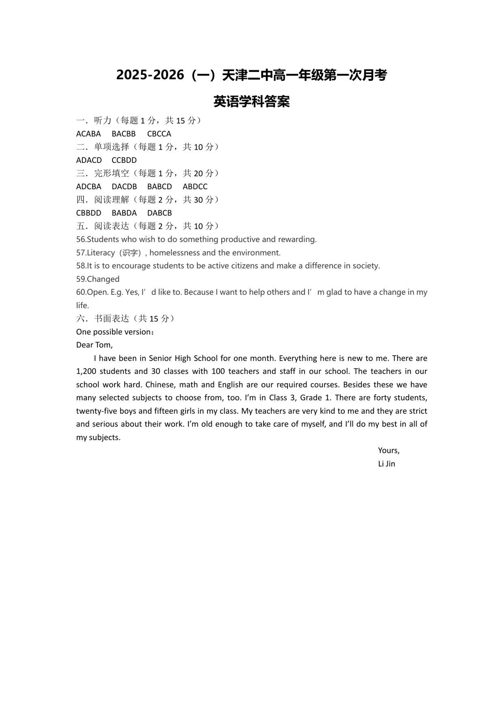 天津市第二中学2025-2026学年高一上学期第一次月考 英语答案.pdf