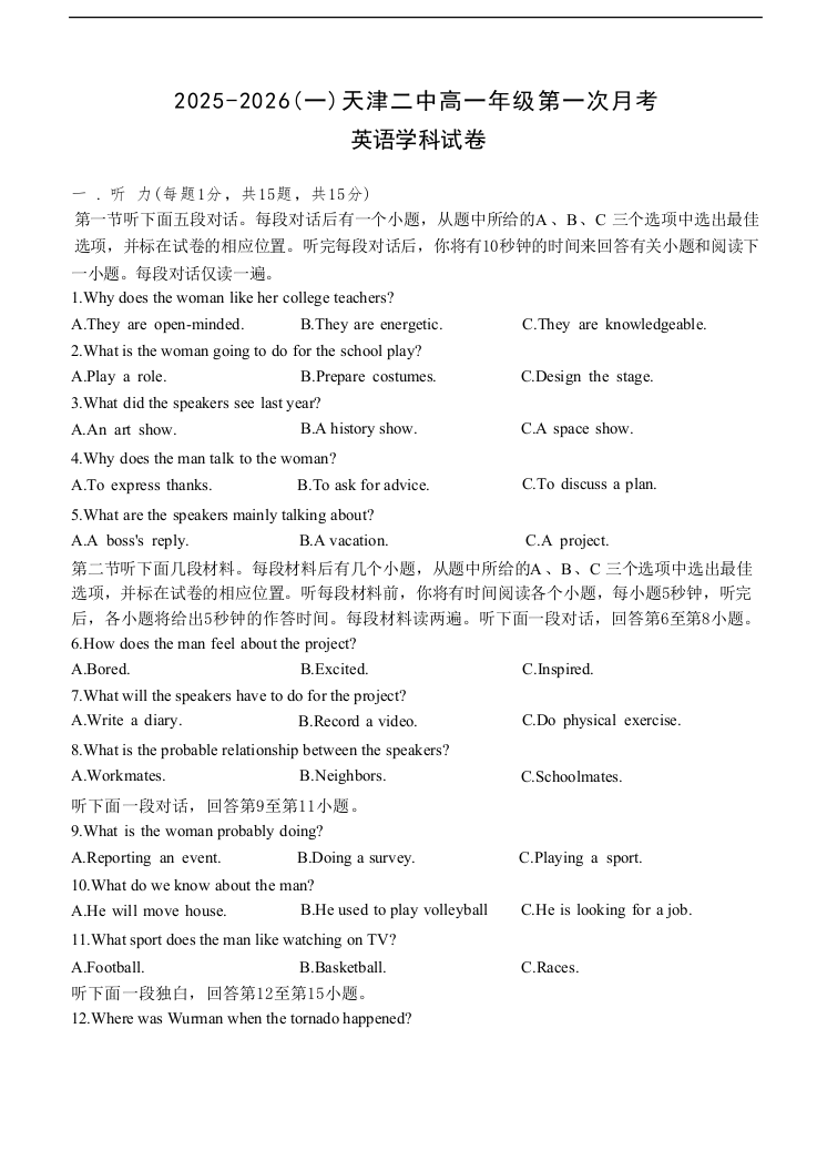 天津市第二中学2025-2026学年高一上学期第一次月考 英语.docx