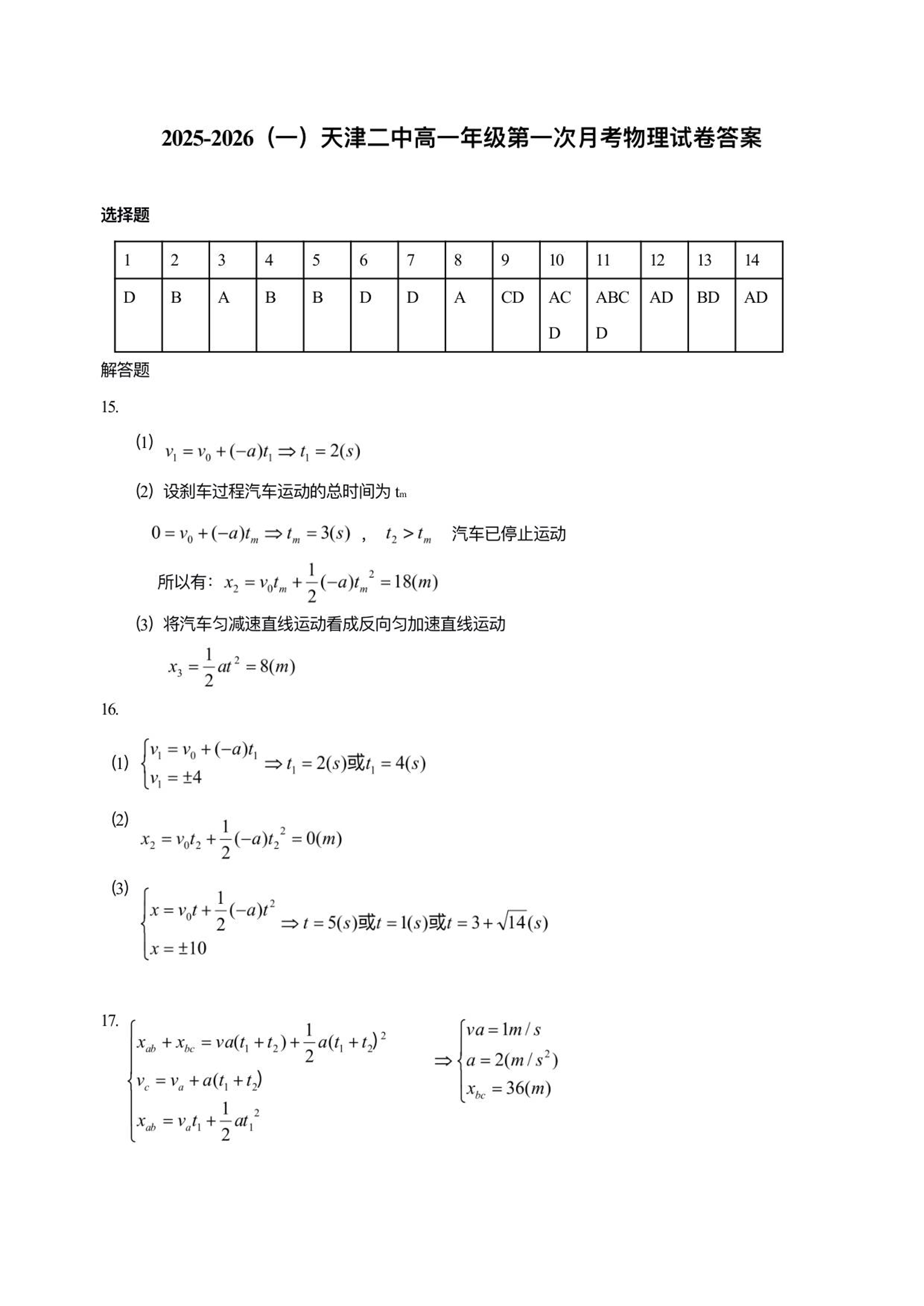 天津市第二中学2025-2026学年高一上学期第一次月考 物理答案.pdf