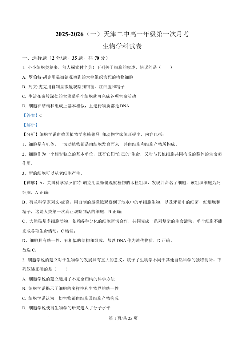 天津市第二中学2025-2026学年高一上学期第一次月考 生物答案.docx