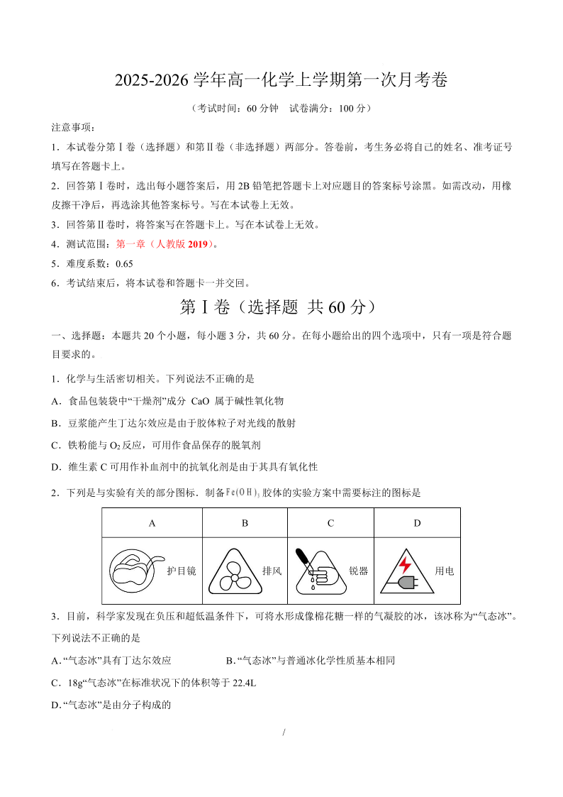 天津市第二中学2025-2026学年高一上学期第一次月考 化学.pdf