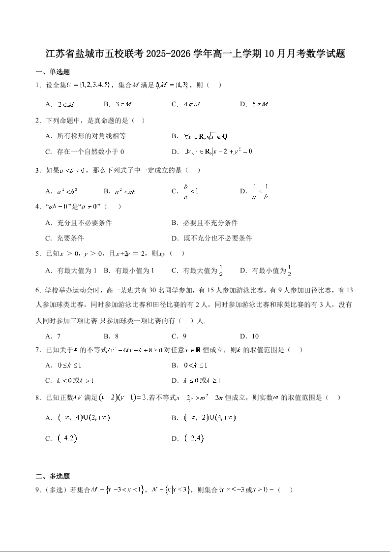 江苏省盐城市五校联考2025-2026学年高一上学期10月第一次联考 数学试题(含答案).docx