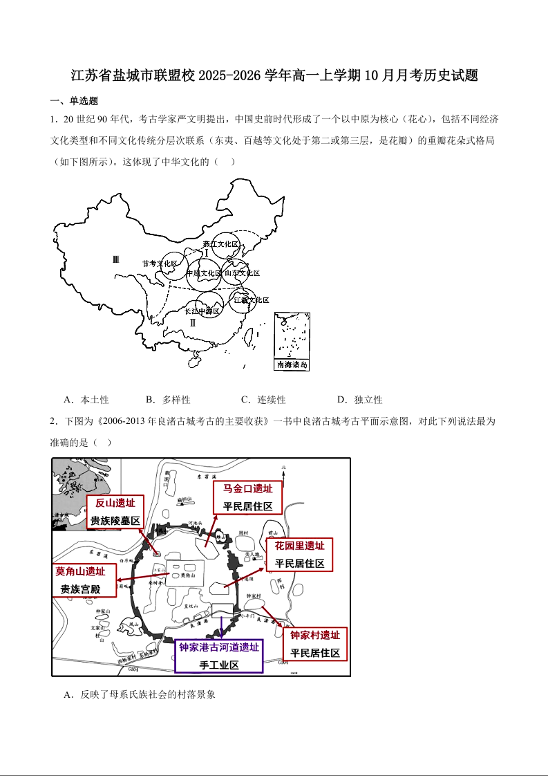 江苏省盐城市五校联考2025-2026学年高一上学期10月第一次联考 历史试题(含答案).docx