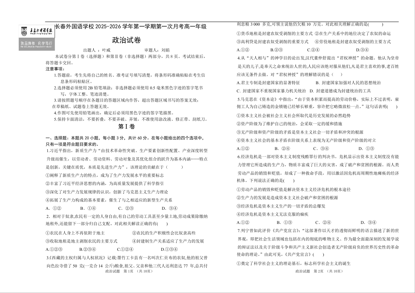 吉林省长春外国语学校2025-2026学年高一上学期第一次月考试题 政治试题(含答案).doc