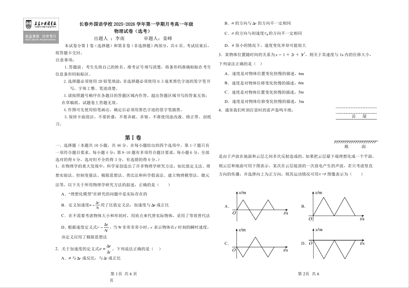 吉林省长春外国语学校2025-2026学年高一上学期第一次月考试题 物理试题(含答案).docx