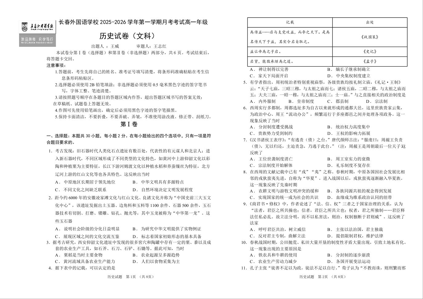 吉林省长春外国语学校2025-2026学年高一上学期第一次月考试题 历史试题(含答案).doc