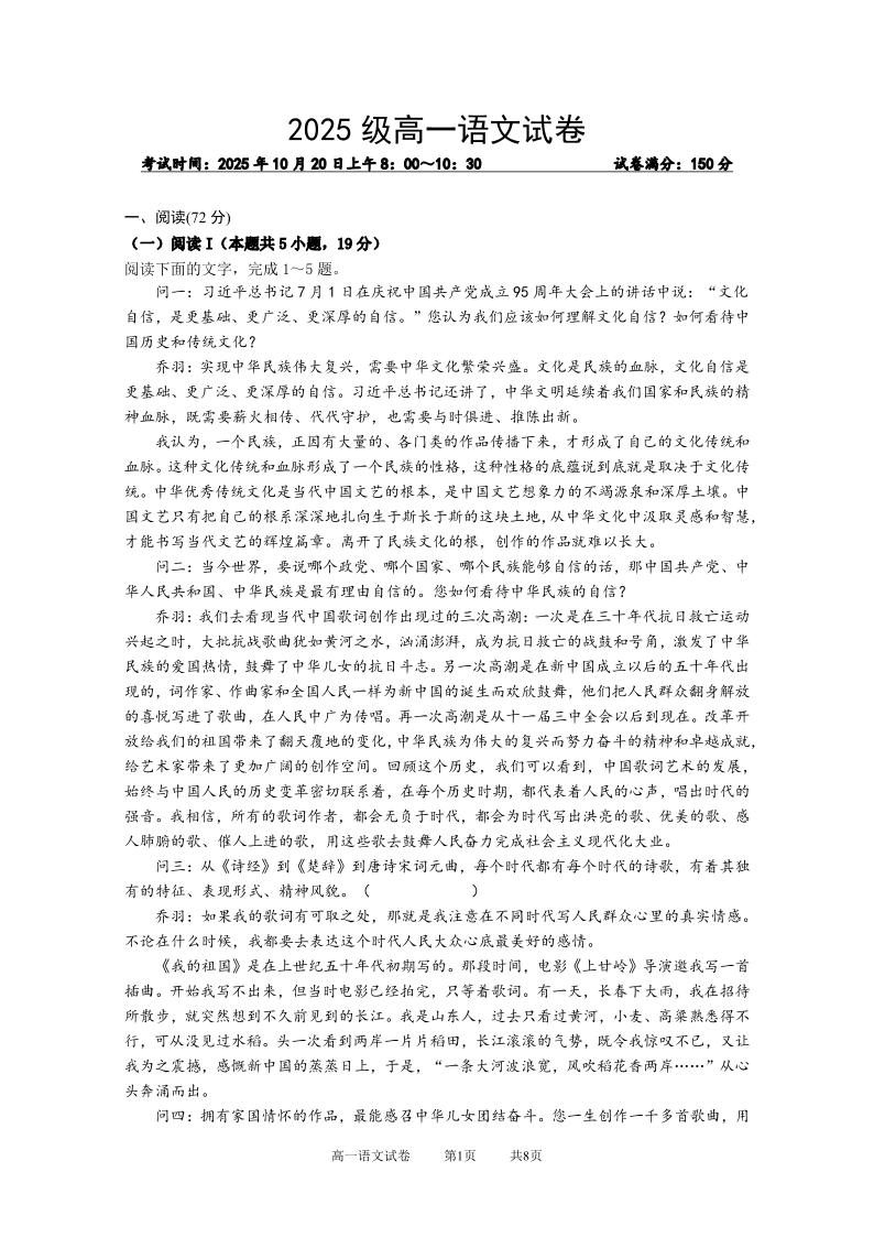 湖北省武汉市部分重点中学2025-2026学年高一上学期10月月考 语文试题(含答案).pdf