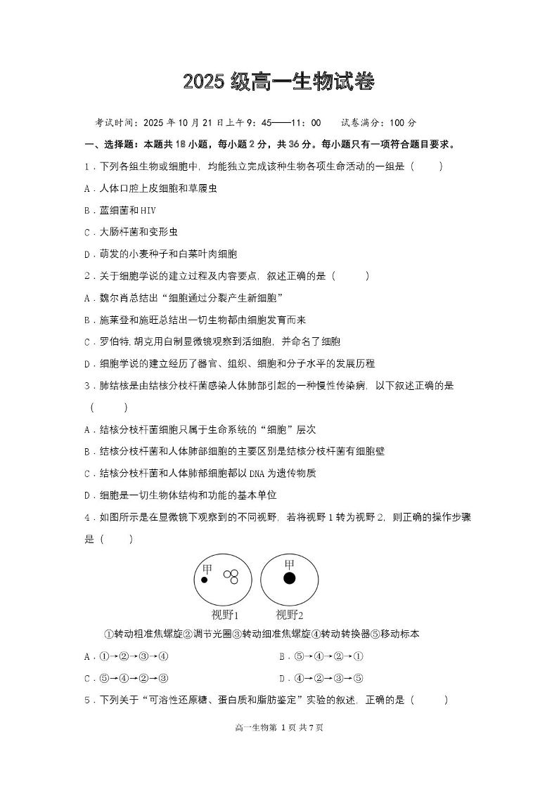 湖北省武汉市部分重点中学2025-2026学年高一上学期10月月考 生物.pdf