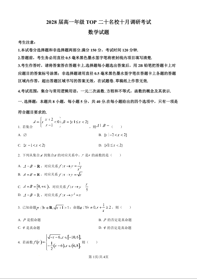 河南省TOP二十名校2025-2026学年高一上学期10月调研考试 数学.docx