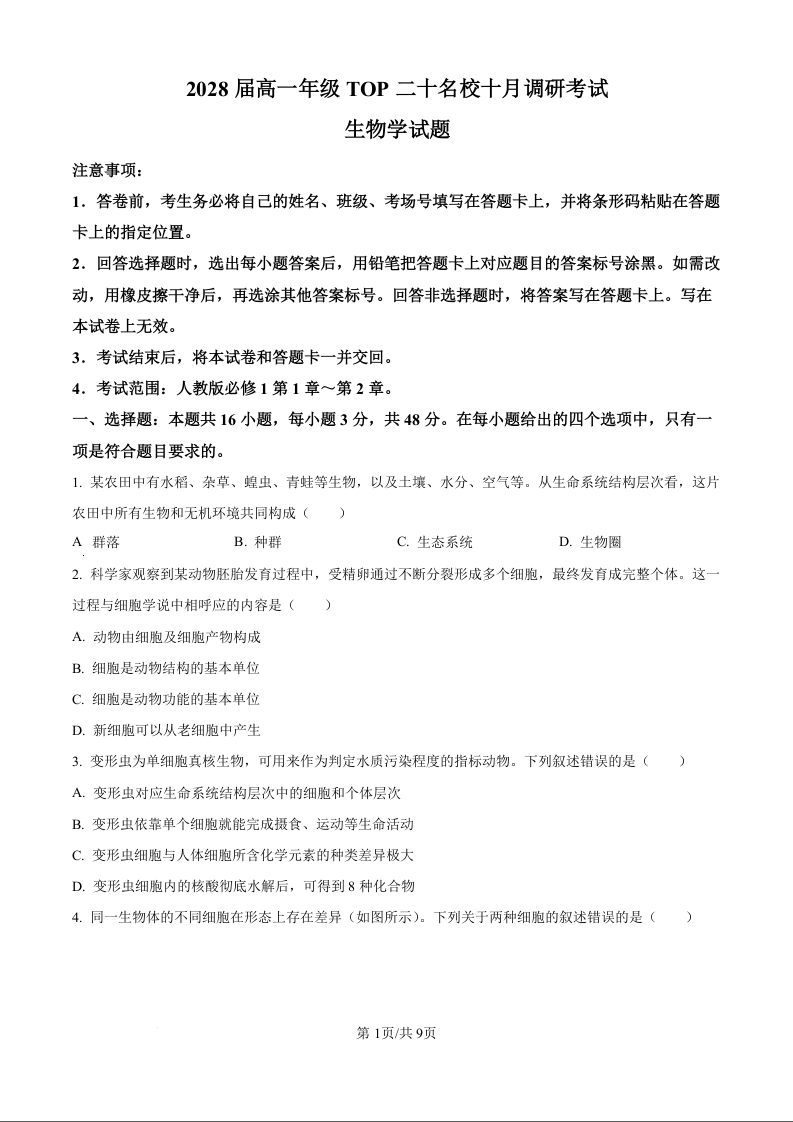 河南省TOP二十名校2025-2026学年高一上学期10月调研考试 生物.docx