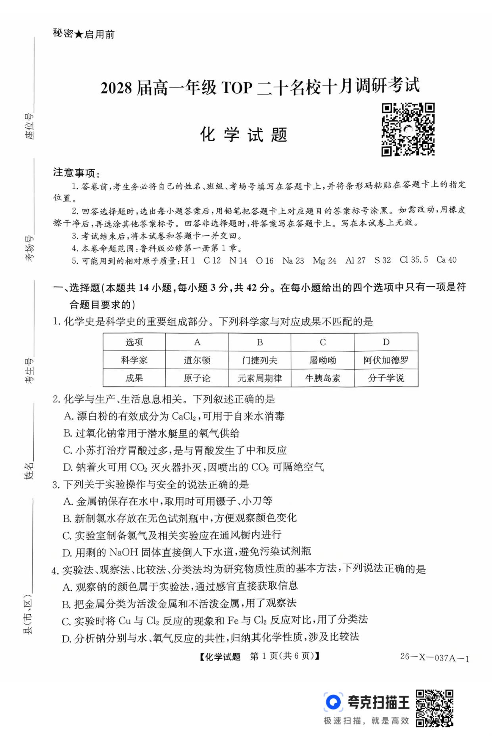 河南省TOP二十名校2025-2026学年高一上学期10月调研考试 化学.pdf