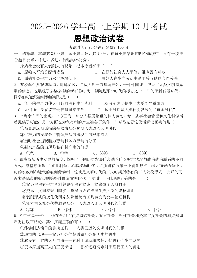 河北省保定市唐县第一中学2025-2026学年高一上学期10月月考 政治试题(含答案).docx