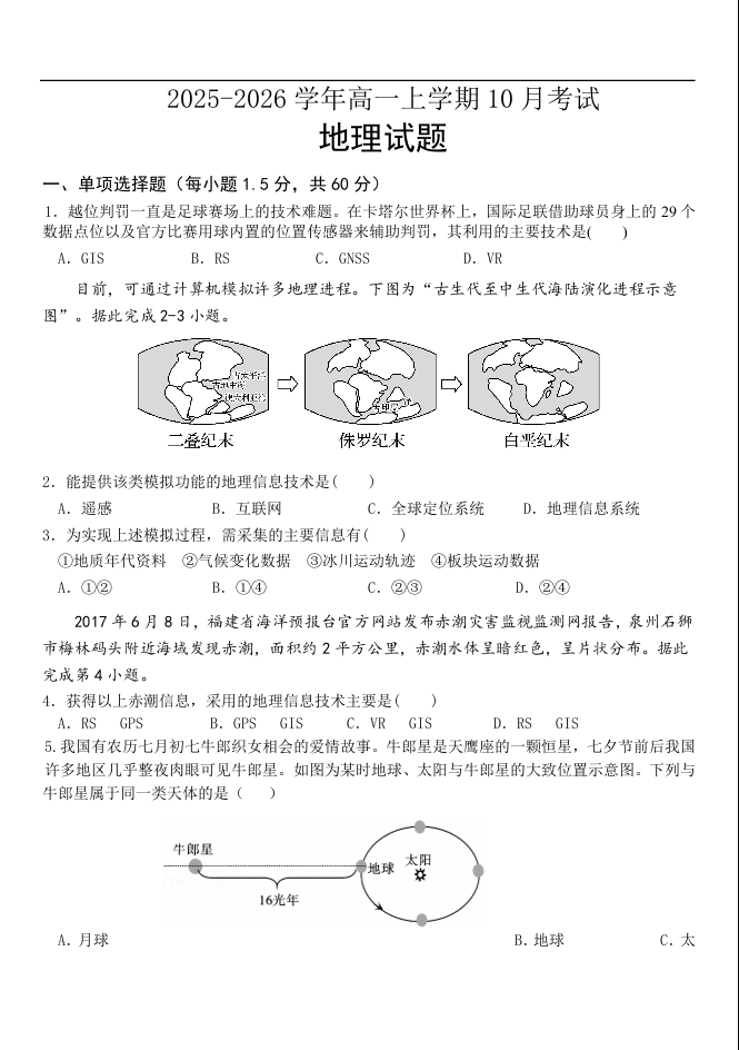 河北省保定市唐县第一中学2025-2026学年高一上学期10月月考 地理试题(含答案).docx
