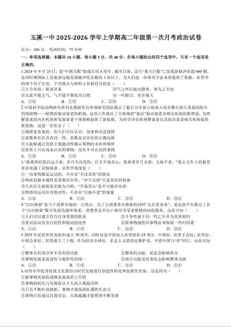 云南省玉溪第一中学2025-2026学年高二上学期第一次月考 政治试卷(含答案).docx