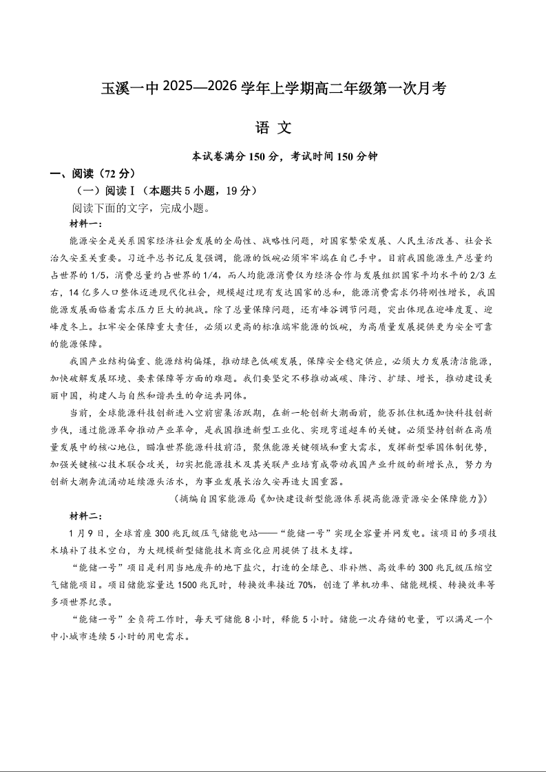 云南省玉溪第一中学2025-2026学年高二上学期第一次月考 语文试卷(含答案).docx
